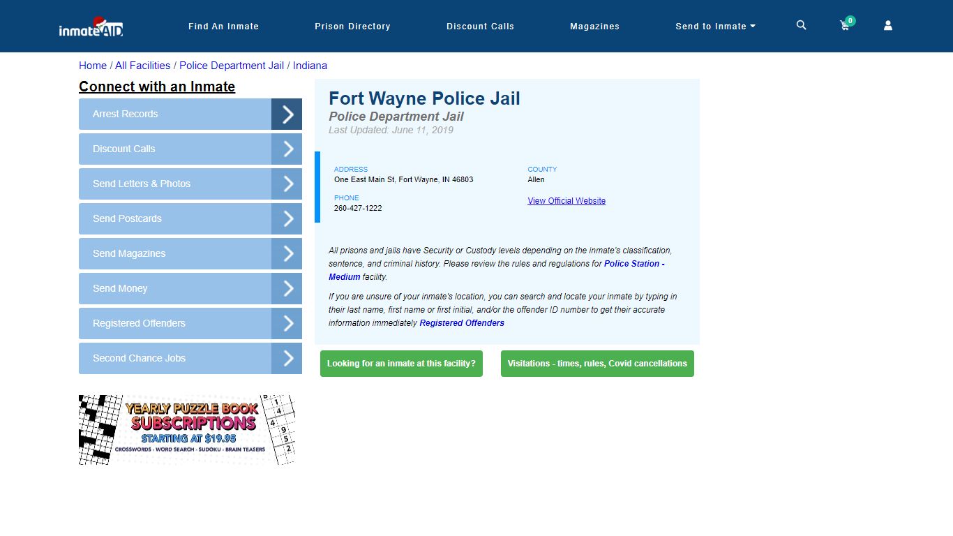 Address One East Main St, Fort Wayne, IN 46803 County Allen Phone 260-427-1222 View Official Website All prisons and jails have Security or Custody levels depending on the inmate’s classification, sentence, and criminal history. Please review the rules and regulations for Police Station - Medium facility.